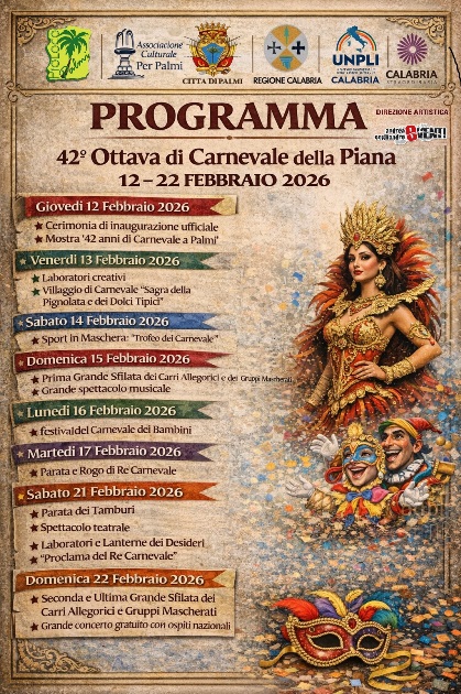 L’evento, promosso dal Comune di Palmi, dalla Pro Loco di Palmi e dall’Associazione Culturale “Per Palmi”, propone un ricco calendario di iniziative tra tradizione, spettacolo, inclusione sociale e promozione territoriale, con la partecipazione di carri allegorici, gruppi mascherati, scuole, associazioni e artisti.