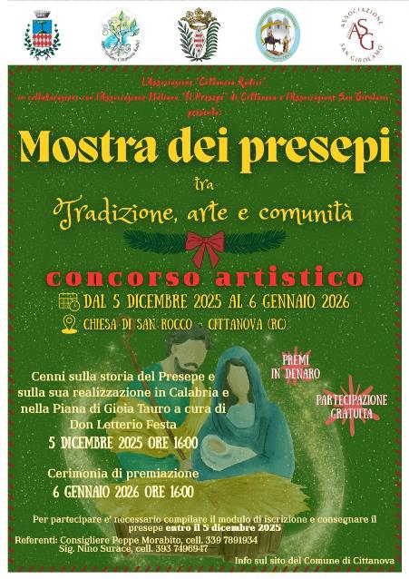 Un percorso artistico capace di intrecciare fede, tradizione e identità. La Mostra dei Presepi di Cittanova, organizzata e promossa dal Comune di Cittanova in collaborazione con le Associazioni Cittadino Radici, Il Presepe e San Girolamo Patrono di Cittanova, con il patrocinio dell’Associazione Siti Storici dei Grimaldi, porterà nella suggestiva Chiesa di San Rocco tutta la magia del Natale: nel segno dell’arte che diventa patrimonio condiviso.