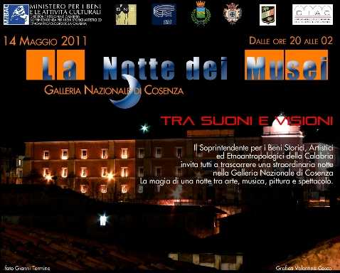 La serata si aprirà, alle ore 20.00, con l’inaugurazione della mostra di arte contemporanea dal titolo Ente Comunale di Consumo, a cura di Claudio Libero Pisano, con il coordinamento generale di Fabio De Chirico e con il coordinamento organizzativo di Nella Mari e Patrizia Carravetta. La Galleria Nazionale di Cosenza resterà aperta dalle ore 20.00 alle 2.00. Sarà visitabile il cantiere di restauro OPERA APERTA. Il restauro del Sant’Agostino di Mattia Preti svela i segreti di un capolavoro. Dalle 22.00 alle 24.00 GiovanInArte, i capolavori della Galleria Nazionale di Cosenza saranno illustrati dagli studenti del Liceo classico “B.Telesio” di Cosenza; dalle 22.00 si terrà, dedicato soprattutto ad un pubblico giovane, la Perfomance Live Writing, a cura di CHINA INK, gruppo di giovani artisti che realizzerà variopinti graffiti. Dalle ore 24.00 alle ore 2.00 la serata sarà accompagnata dai suoni di DJ SET, a cura di SHIRT VS T-SHIRT Robert Eno e Fabio Nirta Partyzan Produzioni. Previste degustazione di vini della Calabria a cura della FISAR (Federazione Italiana Sommelier Albergatori Ristoratori) delegazione di Cosenza coordinamento Tommaso Caporale. Sarà, inoltre, allestita una postazione di editoria d’arte a cura della Libreria UBIK con uno stand di libri (illustrati d’arte, testi di storia locale e di etnoantropologia). Per raggiungere Palazzo Arnone e i luoghi d’arte del centro storico si potrà usufruire di un servizio gratuito di navetta con partenza da piazza dei Bruzi a cura del Comune di Cosenza e dell’Amaco.