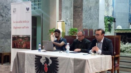 Molto incisivo anche don Demetrio Sarica che ha spiegato ai tanti presenti l’impegno della diocesi nella promozione e nella tutela del suo ricco patrimonio di bellezza. «Ci ritroviamo qua stasera – ha affermato il direttore diocesano dei Beni culturali – innanzitutto per discutere sulla bellezza e ragionare sull’arte ma anche a proporre visivamente in questi pannelli che sono nelle cappelle di questa chiesa di San Giorgio al Corso degli spunti di riflessione del Magistero». Effettivamente la mostra ha attinto molto dal Magistero e durante il dibattito si è ricordata la preoccupazione di papa Francesco di esortare proprio alla formazione e all’educazione all’arte e quindi vivacità a questo patrimonio artistico e di pensiero. Rivolgendosi ai partecipanti del dibattito, ha continuato il suo discorso spiegando che attraverso questa mostra «Avete anche delle immagini che sono scelte perché richiamano e commentano il Magistero e a loro volta sono commentate dal Magistero. Ed è molto bella questa corrispondenza come sottolineava Paolo VI, l’amicizia fra la Chiesa e l’arte».