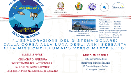 La manifestazione di apertura si terrà lunedì 18 aprile a Reggio di Calabria alle ore 10.00 presso il Palazzo Provinciale “Corrado Alvaro”, a cura del Planetario Provinciale Pythagoras.