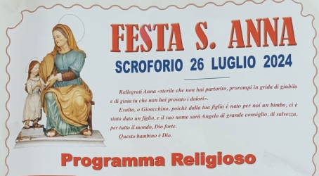 Per il 26 luglio il programma religioso prevede la santa messa delle ore 20,00 e la seguente processione della Sacra Effige di Sant’Anna. Per quanto riguarda il programma civile, dalle ore 21,30 si terranno il tradizionale “Ballo del Ciuccio” e l’accensione dei fuochi pirotecnici.