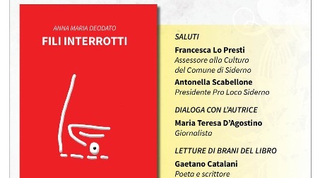 “Fili interrotti” è il titolo del libro di Anna Maria Deodato, edito da Gruppo Albatros Il Filo, che verrà presentato sabato 27 maggio nella Sala del Consiglio del Comune di Siderno alle ore 18:30.
