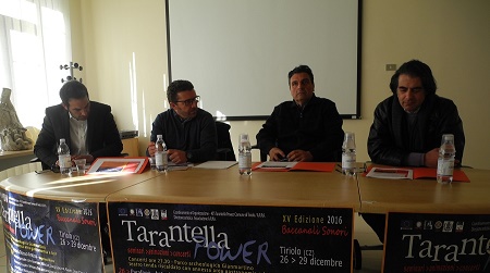 TIRIOLO – Parafonè, Antonio Pascuzzo e Rosso Antico. E ancora: Gioman, Killacat, Loop Loona, Kiave, Don Diegoh, Luchano, Francesca Lupis e Viviana Ess accompagnati dalla South Vibes Bnd e con Dj set Kissusenti Crew e Dj Kerò. Per poi passare al Canzoniere Grecanico Salentino e chiudere in bellezza con Michele Placido e Phaleg. Sono questi i grandi artisti che saliranno sul palco dell’edizione numero XV del “Tarantella Power”, il festival tematico sulla danza e la musica tradizionale calabrese creato e diretto dall’associazione Arpa, in programma da lunedì 26 a giovedì 29 dicembre nel Parco archeologico di Gianmartino nel comune di Tiriolo. Ed è così che “Tarantella Power” si arricchisce di quei “Baccanali Sonori” che faranno del festival un punto di riferimento culturale per tutta la regione, da zona di frontiera e sperimentazione artistica, in cui i diversi linguaggi si confrontano e si combinano dando origine a un’attualità multicolore, la cui identità è la trasformazione continua. L’evento – cofinanziato dalla Regione Calabria con i fondi destinati agli eventi culturali 2016 e affidato alla direzione artistica dell’Arpa, che fa parte dell’associazione temporanea di scopo costituita assieme al Comune di Tiriolo per il coordinamento e organizzazione del festival – è stato presentato questa mattina nella sede del Comune di Tiriolo del sindaco di Tiriolo Domenico Greco, dei direttori artistici Danilo Gatto e Antonio Critelli e di Francesco Renda, direttore provinciale della Lilt Catanzaro (ha portato i saluti della presidente Concetta Stanizzi). Musica e danza all’insegna della valorizzazione delle risorse locali, quindi, per recuperare le radici di una storia meravigliosa, da non dimenticare. Nel teatro tenda riscaldato si susseguiranno artisti diventati riferimento della musica popolare non solo calabrese, mentre l’area archeologica, diventerà protagonista assoluto dell’evento, assieme alla musica popolare, grazie anche all’iniziativa “Cantiere Aperto: comunicare la conservazione”, che si svolgerà in collaborazione con il MIBAC/ Soprintendenza Archeologica Belle Arti e Paesaggio Calabria. Un cantiere aperto che oltre ad avere valenza didattica, restituirà al paese un bene archeologico perfettamente restaurato. Dalle 16 alle 20 presso l’Antiquarium di Tiriolo la restauratrice Aba Muleo curerà in pubblico il restauro di alcuni reperti archeologici ritrovati presso l’area Gianmartino nel corso della campagna di scavo 2014/2015.