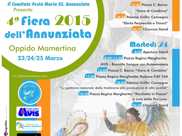 Anche quest’anno ad Oppido Mamertina va in scena la “Fiera dell’Annunziata”. Una tre giorni, dal 23 al 25 Marzo, di esposizioni artistiche di pittura e scultura, di prodotti culinari locali, di attrezzature agricole ed industriali e di strumenti per la musica popolare (zampogne, organetti e tamburelli).
