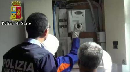 Il frame tratto da un video diffuso il 24 settembre 2014 dalla Polizia di Stato mostra un momento dell'operazione al termine della quale la squadra mobile della Questura di Ragusa ha denunciato per truffa aggravata i titolari di due bar, uno del capoluogo ibleo e l'altro di Santa Croce di Camerina, per il furto di energia elettrica. Secondo l'accusa avrebbero utilizzato un grosso magnete per falsare i reali consumi. Il danno, negli anni, per l'Enel è stato stimato dalla polizia in circa 100.000 euro. ANSA/ POLIZIA DI STATO +++ HO - NO SALES, EDITORIAL USE ONLY +++