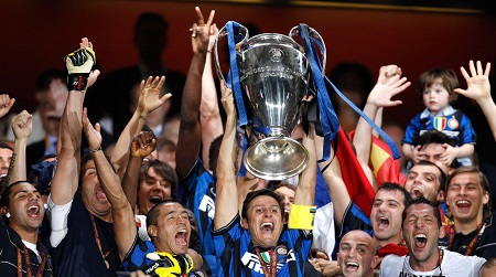 Inter Milan defender Javier Zanetti holds up the cup with his team after winning the Champions League final soccer match between Bayern Munich and Inter Milan at the Santiago Bernabeu stadium in Madrid, Saturday May 22, 2010. (AP Photo/Antonio Calanni)