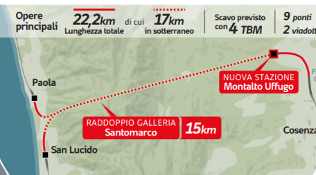 • I lavori della tratta Paola-Cosenza includono il raddoppio di oltre 22 km di linea, quasi tutti in sotterraneo, inclusa la nuova Galleria Santomarco che si estenderà per poco più di 15 km