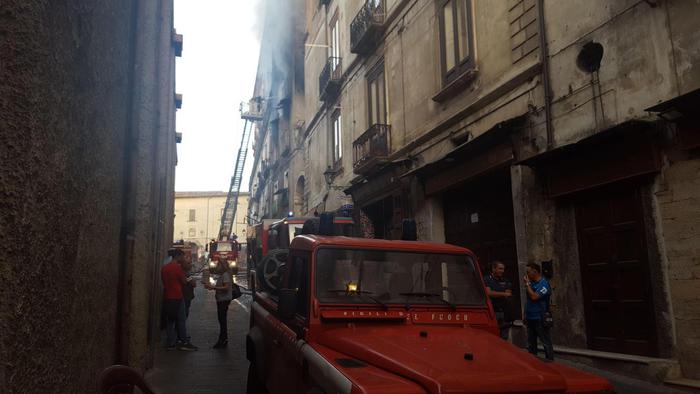 Vigili del fuoco al lavoro sull'incendio che si è sviluppato in un appartamento di uno stabile nel centro storico di Cosenza, 18 agosto 2017. ANSA