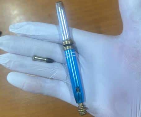 L’arma clandestina, prodotta artigianalmente e celata in altro oggetto, in questo caso con le fattezze e dimensioni di una biro, è particolarmente facile da occultare, ma altrettanto offensiva e pericolosa per le persone, soprattutto poiché rinvenuta con un proiettile Cal. 22 compatibile con la penna – pistola.