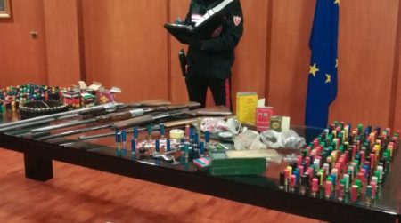 L’attività di controllo ha permesso di scovare, celati all’interno di un armadio, 3 fucili da caccia calibro 12 illegalmente detenuti, una carabina ad aria compressa, una cartucciera con all’interno 30 cartucce a pallini calibro 12, 654 cartucce calibro 12 varie marche delle quali 10 a palla unica e le restanti a pallini nonché 3 confezioni con polvere da sparo dal peso complessivo di oltre 1,2 kg e macchinari per la realizzazione domestica delle munizioni. Gli investigatori hanno avviato le indagini volte ad accertare eventuale utilizzo di armi e polvere da sparo. Il tutto è stato sottoposto a sequestro mentre l’uomo è stato dichiarato in stato di arresto e trattenuto presso la propria abitazione in regime degli arresti domiciliari a disposizione della Procura di Cosenza.