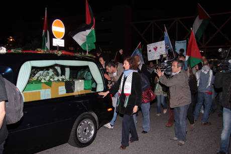 (ANSA) L’aereo dell’Alitalia proveniente dal Cairo con a bordo la salma di Vittorio Arrigoni, il volontario ucciso a Gaza, è giunto all’aeroporto Leonardo da Vinci di Fiumicino (Roma). Si tratta del volo di linea AZ897. Subito dopo che la bara di Vittorio Arrigoni è stata fatta scendere dall’aereo e caricata su un carrello che l’avrebbe poi portata alla Cargo City per il disbrigo delle pratiche burocratiche, al Leonardo da Vinci si è svolta una breve cerimonia. Il feretro era avvolto da bandiere palestinesi e sopra una piccola corona di fiori su cui campeggiava la scritta: Vittorio, we will never forget you. Monsignor Hilarion Capucci e gli altri componenti della delegazione del presidente Abu Mazen hanno sostato a lungo di fronte al feretro.