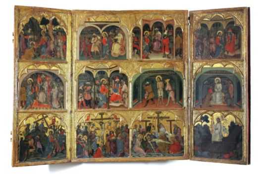L’opera, che venne ascritta al maestro toscano da Giovanni Paccagnini nel 1948, contiene in nuce elementi riconducibili alla pittura gotica della prima metà del Trecento. Verosimilmente commissionata da Filippo Sangineto, feudatario di Altomonte, è espressione del gusto di un potere signorile colto e raffinato. Il percorso espositivo continua con le due tavole di Bernardo Daddi raffiguranti San Giovanni Battista con Santa Maddalena e Sant’Agostino con San Giacomo, probabilmente parti di un trittico il cui pannello centrale è andato disperso. Segue la Madonna delle Pere, l’enigmatica tavola attribuita a Paolo di Ciacio da Mileto. L’altarolo con storie della Passione di Cristo, commissionato dalla contessa Cobella Ruffo, è opera che segna una netta linea di demarcazione rispetto ai contemporanei sviluppi stilistici dell’arte locale. Il percorso si chiude con le due finissime lastre in alabastro, con storie della Vita della Vergine e storie della Vita di Cristo e Giudizio Universale, scolpite a bassorilievo da maestri francesi.