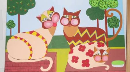 “Il dipinto, è un omaggio ai nostri amici domestici, che allietano la nostra esistenza, facendoci compagnia. In versione felina, illustra una famiglia di bei micioni accoccolati su un muretto, costituito da mattoni, che sta ad indicare le pareti domestiche, ossia la casa.