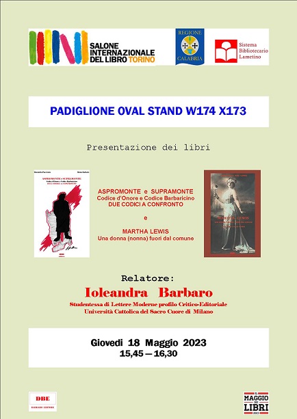 E’ stato presentato al Salone del Libro di Torino presso lo stand della Regione Calabria il libro “Aspromonte e Supramonte – Codice d’onore e Codice Barbaricino – Due codici a confronto” scritto a quattro mani da Remo Barbaro e Donatella Pau Lewis, edito dalla rinata casa editrice DBE BARBARO EDITORE che mantiene le proprie origini calabresi con la sede operativa a Oppido M.