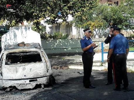 I carabinieri davanti alla carcassa dell'auto, data alle fiamme, dei vigili urbani di Satriano.