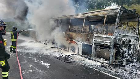 Autobus in fiamme in Calabria, il conducente riesce a far scendere tutti i passeggeri prima di essere avvolto completamente dal fuoco