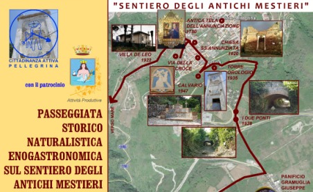Il “sentiero degli antichi mestieri” era il principale percorso pedonale che dal centro di Bagnara Calabra portava sui pianori della zona collinare di Pellegrina, dove intercettava la via Popilia e da lì nell’area preaspromontana. I massari, i circari, i zappaturi, i panetteri, i carvunari, i ramari, “a bagnarota” che andava a commerciare nelle zone interne, e comunque tutte le donne “i fimmini” dedite alla raccolta delle olive e ai lavori nei campi, percorrevano quotidianamente a piedi il sentiero. Il tratto che verrà percorso da quanti vorranno partecipare alla passeggiata storico-naturalistica enogastronomica di domenica 10 giugno è quello che attraversava, ed oggi ancora attraversa, l’abitato del borgo di Pellegrina per condurre sui pianori.