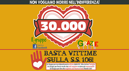 È apparso nella tarda serata di ieri sera alle ore 23 circa il messaggio di ringraziamento di Daniela Giuranna, amministratrice insieme a Maria Chimenti, Tino Marino, Marco Parrilla e Fabio Pugliese (quest’ultimo ne è il fondatore), del Gruppo facebook “BASTA VITTIME SULLA S.S.106” l’organo ufficiale di informazione sui social network dell’Associazione omonima che ieri sera ha superato le 30.000 adesione. Un risultato storico ed incredibile raggiunto in un anno da un gruppo che attraverso il web ha intrapreso una battaglia di civiltà che si pone un obiettivo molto chiaro: l’urgente e necessaria messa in sicurezza della S.S. 106 ed il suo ammodernamento.
