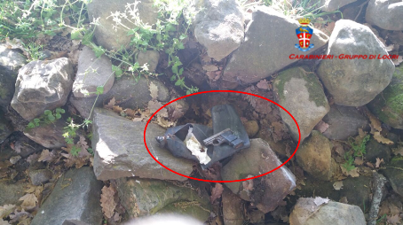 - una pistola “Bernardelli” cal. 6.35, in discreto stato di conservazione, con matricola abrasa e caricatore con 6 proiettili inserito, occultata all’interno di una camera ad aria di uno pneumatico nascosta tra le rocce;