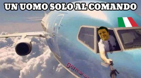 Grillo paragona Renzi a Lubitz: “Un uomo solo al comando, se non si interviene farà schiantare l’Italia”. D’Alema, da fuori, sta furiosamente cercando di aprire la cabina.