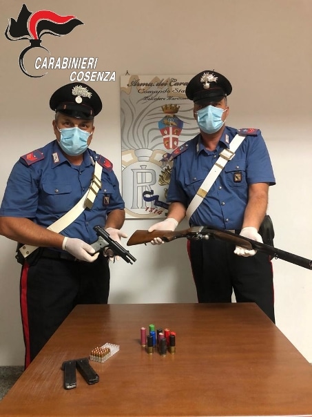 Nonostante l’uomo non sia implicato nelle indagini relative all’omicidio della 55enne bulgara, il suo arresto matura nel medesimo contesto operativo. In particolare, nella tarda mattinata del 17 settembre 2020, nel corso della perquisizione domiciliare disposta dalla Procura di Paola, i Carabinieri operanti si sono presentati presso l’abitazione dell’uomo. Durante le fasi della perquisizione l’uomo è apparso molto sofferente al controllo subito quando, con scaltrezza, riesce a guadagnare la sua stanza da letto accusando la necessità di indossare una maglietta. Una volta entrato nella camera da letto ha preso un borsello e si portato all’esterno attraverso una finestra che dava sul giardino posteriore dell’abitazione. Suo malgrado, però, si è trovato davanti i Carabinieri posti a cinturazione dell’abitazione che, dopo averlo bloccato, hanno constatato la presenza nel borsello di una pistola 98FS, avente matricola abrasa, con 30 cartucce 9×21 custoditi all’interno di due caricatori. Proseguendo nelle operazioni di perquisizione i militari hanno poi rinvenuto, occultati sempre nella camera da letto dell’uomo, 10 cartucce per fucile segnale univoco della detenzione anche di un arma lunga. Infatti, occultato nel bagagliaio dell’autovettura in uso all’uomo, è stato rinvenuto un fucile doppietta calibro 16.