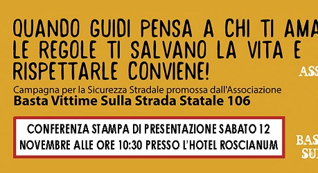 Sicurezza stradale: al via una imponente iniziativa dell’Associazione “Basta Vittime Sulla Strada Statale 106” di educazione e di sensibilizzazione alla sicurezza stradale. Il progetto partirà dalle scuole secondarie di primo e secondo grado della costa jonica cosentina da Roseto Capo Spulico fino a Cariati.