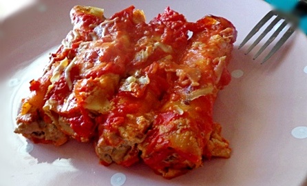 5. Mettete parte del sugo in una teglia, adagiate i cannelloni e ricoprite con l’altra metà.