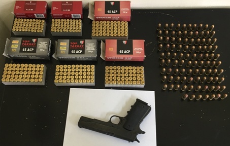 Durante i controlli, a bordo di una Fiat Panda condotta da un trentenne di Tropea, i militari hanno rinvenuto più di 300 proiettili Calibro 45 occultati sotto il sedile del guidatore. Subito è scattata la perquisizione  a casa del fermato, appartamento contiguo e comunicante con quello in uso al suocero dello stesso. E proprio a casa del suocero del giovane sono stati rinvenuti, ben occultati in un marsupio nascosto all’interno di una credenza, tra bicchieri ed album di famiglia: