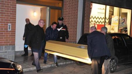 Necrofori portano via la salma dall'abitazione dove un uomo di 64 anni ha accoltellato in casa la moglie di 52 anni uccidendola, Pinerolo (Torino), 28 marzo 2017. ANSA/ANTONINO DI MARCO