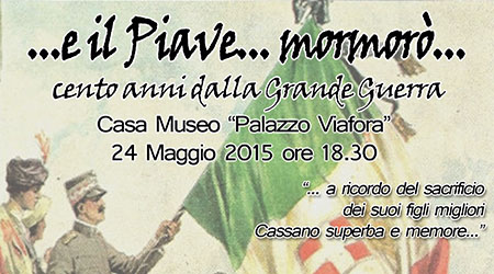L’Associazione “Palazzo Viafora” è lieta di presentare al pubblico l’iniziativa “…E il Piave… mormorò… – cento anni dalla Grande Guerra”, predisposta sotto la direzione tecnica ed organizzativa del Prof. Francesco D’Elia, per lunghi anni ordinario di Storia e Filosofia presso il Liceo Ginnasio “R.L.Satriani” di Cassano Ionio e patrocinata dall’Amministrazione Comunale di Cassano Ionio, Assessorato alla Cultura.