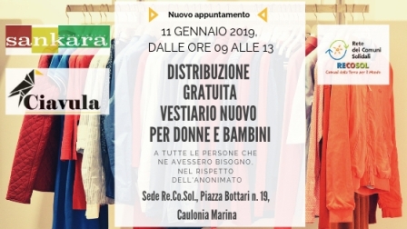Dopo l’ottimo risultato della distribuzione del 4 gennaio 2019 presso la sede Re.Co.Sol. di Caulonia Marina, dove la Soc. Cooperativa “Sankara” e la testata giornalistica online “Ciavula” hanno consegnato gratuitamente alle famiglie calabresi, e non solo, vestiario assolutamente nuovo e con etichetta per un valore di 9489 euro, si è deciso di replicare la distribuzione gratuita del vestiario. Pertanto, grazie ancora una volta alla disponibilità dei locali della nuova sede cauloniese di Re.co.sol.-Rete dei Comuni Solidali, di cui la Società Cooperativa “Sankara” è partner, venerdì 11 gennaio 2019 verrà effettuata nuovamente la distribuzione gratuita dei capi d’abbigliamento nuovi, nel completo rispetto dell’anonimato, a tutti coloro ne avessero bisogno. Invitiamo, quindi, tutta la cittadinanza a divulgare la notizia di questo appuntamento affinché si possa raggiungere il maggior numero di persone bisognose possibili. La distribuzione avverrà presso la nuova sede di Re.co.sol., in piazza Bottari n. 19, a Caulonia Marina, venerdì 11 gennaio 2019, dalle ore 09 alle ore 13.
