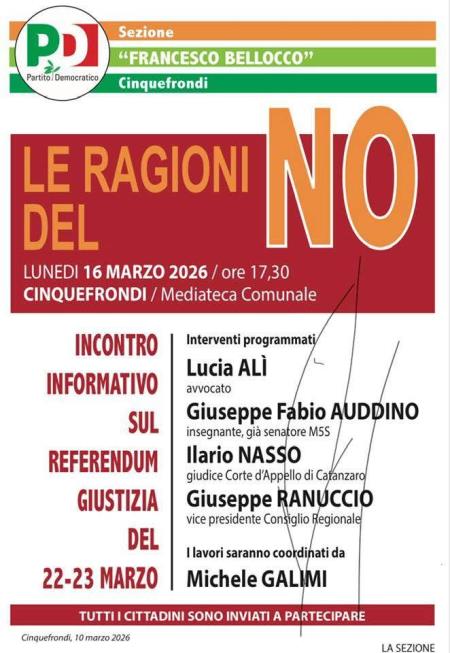 Evento a Cinquefrondi sul Referendum Giustizia, “Le ragioni del No” lunedì 16 marzo alle ore 17.30