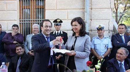 Il presidente del Camera, Laura Boldrini, riceve la cittadinanza onoraria dal sindaco di Riace, Domenico Lucano, 12 luglio 2013. ANSA/FRANCO CUFARI