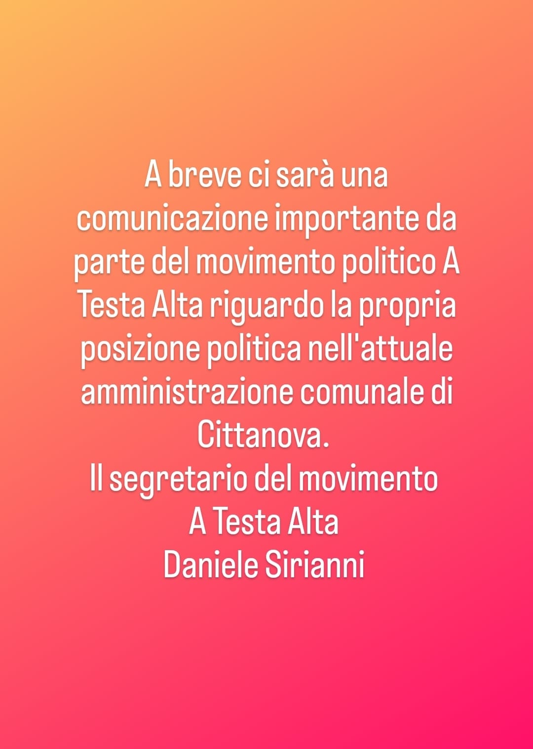 A cittanova c’è Aria di crisi! A testa alta esce fuori dall’amministratore comunale?cosi si evince da un post pubblicato sui sociali dal segretario del movimento cittadino Daniele Sirianni, secondo, cui a breve ci saranno importanti comunicazioni riguardanti la propria posizione politica in seno all’amministrazione Cosentino.Al di la di ogni considerazione politica , il movimento annovera tra le proprie file l’ex vice presidente del consiglio regionale della Calabria Francesco D’agostino ed attuale consigliere comunale.
