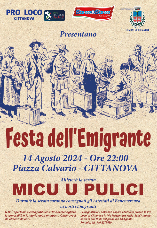 Si svolgerà il prossimo 14 agosto la Festa dell’Emigrante di Cittanova. Un’occasione straordinaria per la Comunità cittadina di riabbracciare i compaesani sparsi per il mondo ma profondamente legati alla loro terra di origine.