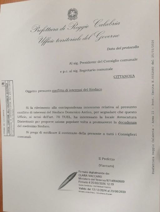 Cittanova, il Prefetto attiva l’azione per la decadenza del Sindaco: altro che chiarimento, la vicenda si aggrava. La vicenda relativa al presunto conflitto di interessi del Sindaco di Cittanova assume contorni sempre più rilevanti sul piano istituzionale. Con nota ufficiale del 25 marzo 2026, la Prefettura di Reggio Calabria ha infatti formalmente attivato, ai sensi dell’art. 70 del TUEL, l’intervento dell’Avvocatura dello Stato per promuovere un’azione popolare finalizzata ad accertare la possibile decadenza del Sindaco.