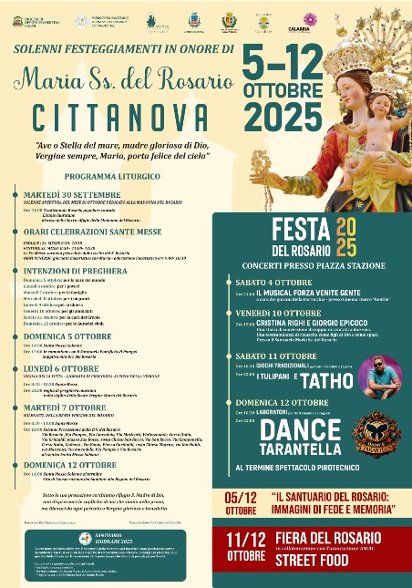 I solenni festeggiamenti in onore di Maria Santissima del Rosario sono entrati nel vivo e Cittanova si sta già trasformando in un luogo di incontro, di fede e di tradizione. Le celebrazioni, aperte nei giorni scorsi con momenti di preghiera e intensa partecipazione, stanno coinvolgendo l’intera comunità in un clima di gioia condivisa, che cresce di giorno in giorno fino a condurre alla data tanto attesa del 7 ottobre, solennità della Beata Vergine del Rosario.