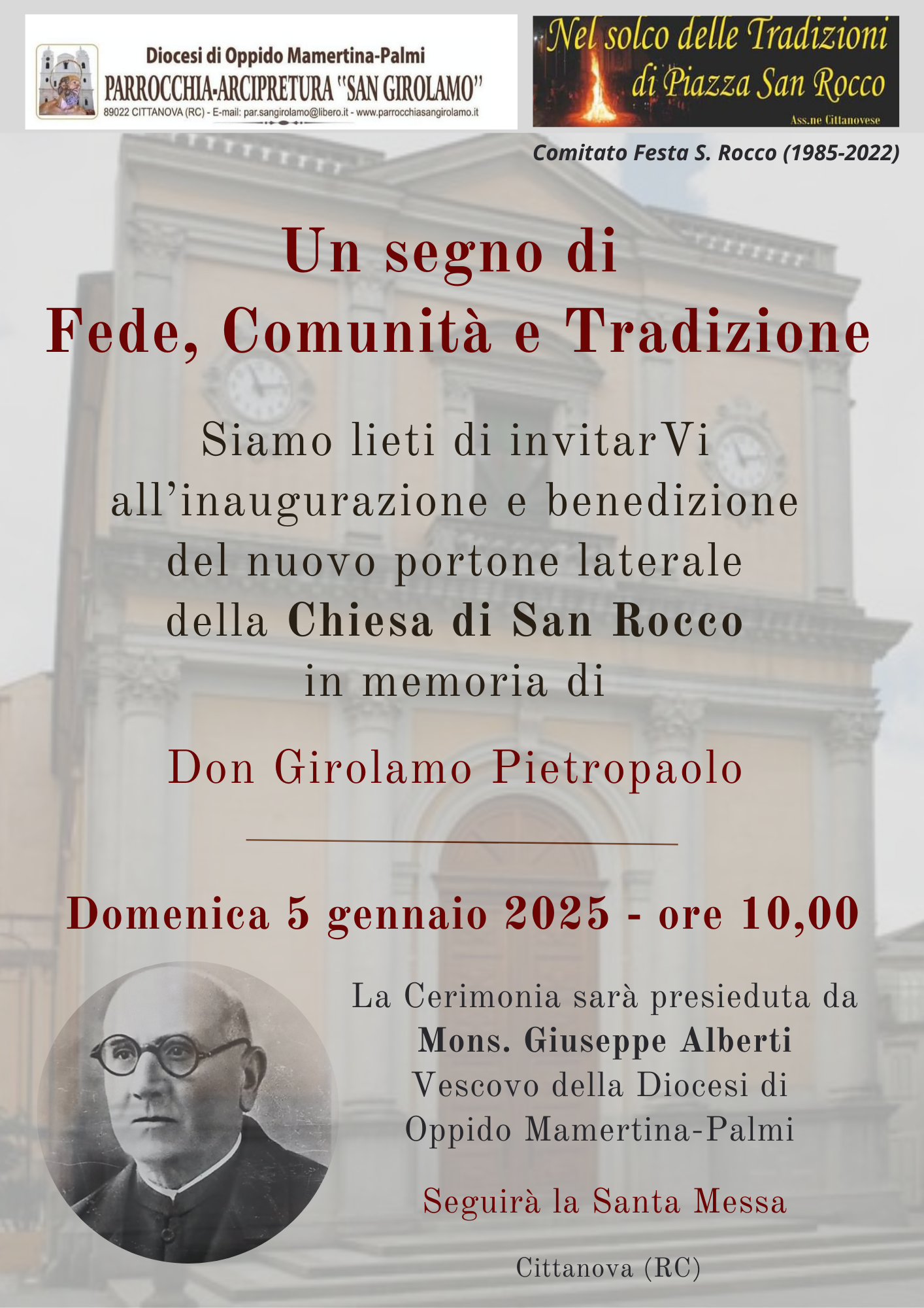 è con grande piacere che Vi invitiamo a partecipare all’inaugurazione e benedizione del nuovo portone laterale della Chiesa di San Rocco di Cittanova, in memoria di Don Girolamo Pietropaolo; un momento significativo per la nostra comunità.