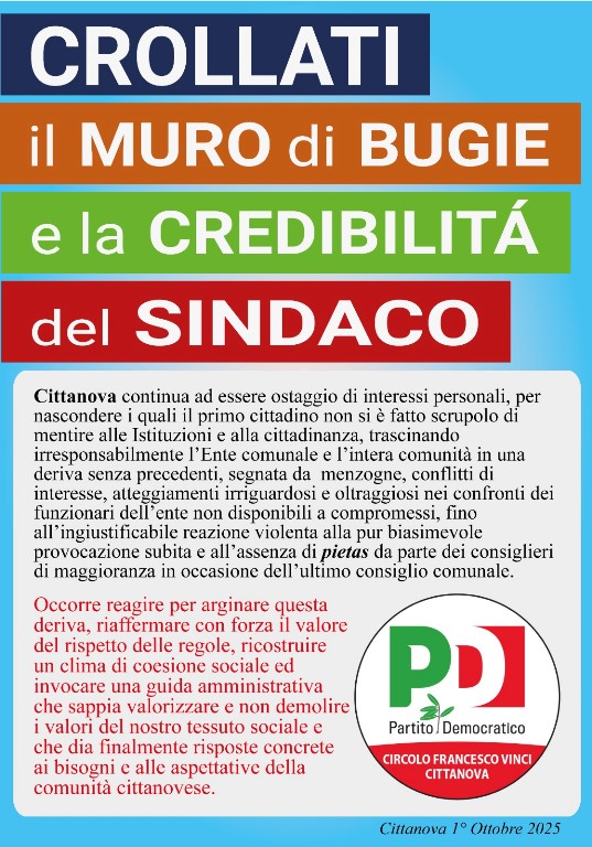 Cittanova, l’attacco del Pd al sindaco Antico, “crollati il muro di bugie e credibilità”, e lo fa con un manifesto affisso per le vie della città.