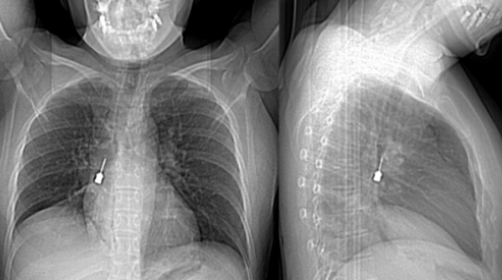 La paziente è giunta al Pronto Soccorso del G.O.M. esibendo un esame di diagnostica per immagini (Tomografia Computerizzata) eseguito a causa di una tosse persistente e di un forte dolore a livello toracico. La TC mostrava la presenza di un corpo estraneo metallico pericolosamente incastrato nel bronco lobare inferiore del polmone destro e un concomitante pneumomediastino, ossia la presenza di aria nello spazio compreso fra i due polmoni.