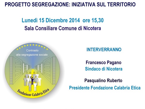 Catanzaro, 13.12. 14 – Lunedì 15 dicembre alle ore 15,30 presso la sala consiliare del Comune di Nicotera, iniziativa pubblica sul tema “contrasto alla segregazione sociale”. Si tratta di un evento – ricadente nell’ambito delle attività sul territorio – promosso dal Centro d’Ascolto di Vibo Valentia che fa capo al progetto pilota misure di contrasto al fenomeno della segregazione sociale in area urbana, gestito dalla Fondazione Calabria Etica e finanziato dall’Unione europea-fondo sociale europeo e dalla Regione Calabria. Alla manifestazione interverranno il sindaco di Nicotera, Francesco Pagano e il presidente della Fondazione Calabria Etica, Pasqualino Ruberto.