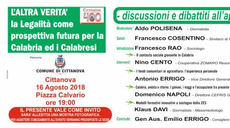 La legalità come principio, come azione morale e politica, come esempio per le nuove generazioni. La legalità come fatto culturale in una Calabria che si racconta e vuole raccontare gli esempi positivi e l’azione coraggiosa di tanti giovani, associazioni, giornalisti, scrittori e imprenditori che sono da sempre impegnati nella battaglia per lo sviluppo economico e la liberazione della nostra terra dalla “tenaglia soffocante” della ‘ndrangheta, che blocca lo sviluppo e tenta di rendere “schiavi e prigionieri” tutti i calabresi. Bisogna dire basta a questo strapotere, incentivando la cultura della legalità e ponendo l’accento su esempi concreti di “Resistenza” e di legalità Occorre però evitare manifestazioni “salottiere” e “festivaliere” per la lotta alla ‘ndrangheta, che spesso si rivelano dannose. Partendo da esempi concreti attraverso il contributo dei protagonisti di questa battaglia: rappresentanti delle forze dell’ordine, giornalisti, imprenditori, educatori, rappresentanti istituzionali si racconterà l’altra verità di una Calabria che vuole invertire la tendenza al declino per realizzare una RIVOLUZIONE DELLE COSCIENZE DI CUI I CALABRESI DOVRANNO ESSERE PROTAGONISTI. L’evento è patrocinato dall’Amministrazione Comunale di Cittanova.