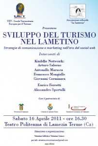 Sviluppo del turismo nel lametino e strategie di comunicazione e marketing nell’era del social web. Questo il titolo dell’incontro che si terrà il prossimo 16 aprile alle 16.30 presso il teatro Politeama di Lamezia Terme e che vuole offrire agli operatori turistici calabresi un momento di analisi e di riflessione sulla promozione turistica delle imprese e del territorio, tenendo conto delle dinamiche e delle tendenze del nuovo web. Un incontro che parte da un focus sulla promozione online e il web marketing del sistema turistico lametino – in particolare del ricettivo alberghiero – ma la cui disamina e le indicazioni che ne emergono possono estendersi a tutto il contesto turistico e produttivo della Calabria. L’evento, ideato e organizzato dalle consulenti in comunicazione Valentina Iuffrida e Valentina Ciriaco, vedrà la partecipazione di alcuni tra i massimi esperti di turismo ma soprattutto del mondo del web e dei social media applicati al settore: Antonello Maresca e Arturo Salerno (consulenza e formazione nel settore web marketing turistico), Giovanni Cerminara (social media marketing turistico) e Francesco Mongiello (amministratore di FormazioneTurismo.com), tutti membri di Kuddle Network ed infine Enrico Ferretti (web & marketing strategies) e Alessandro Sportelli (elaborazione di strategie di marketing per Facebook). Lo scopo è quello stimolare le potenzialità di sviluppo turistico dell’intera area lametina, partendo dai punti deboli della promozione del territorio nell’era del social web. Si è partiti da una ricerca sulla presenza on line delle strutture ricettive lametine: dalla presenza degli elementi principali di un sito web turistico alla promozione sui motori di ricerca, passando per la ricerca di una identità nei social network. Uno screening meticoloso da cui prendere spunti, suggerimenti e indicazioni operative per affrontare il futuro con maggiore determinazione, contribuendo da un lato alla valorizzazione delle qualità del territorio, dall’altro a suggerire strumenti per la promozione turistica dello stesso. Un progetto ambizioso, sostenuto dell’associazione culturale “La Lanterna O.n.l.u.s.”, che da anni si occupa della promozione culturale del territorio calabrese e della UET Italia, che si occupa di formare professionisti del comparto turistico-alberghiero, sempre attenta a quelle che sono le nuove tendenze ed esigenze del settore. L’appuntamento è al Teatro Politeama di Lamezia Terme a partire dalle ore 16,30. Ingresso libero.