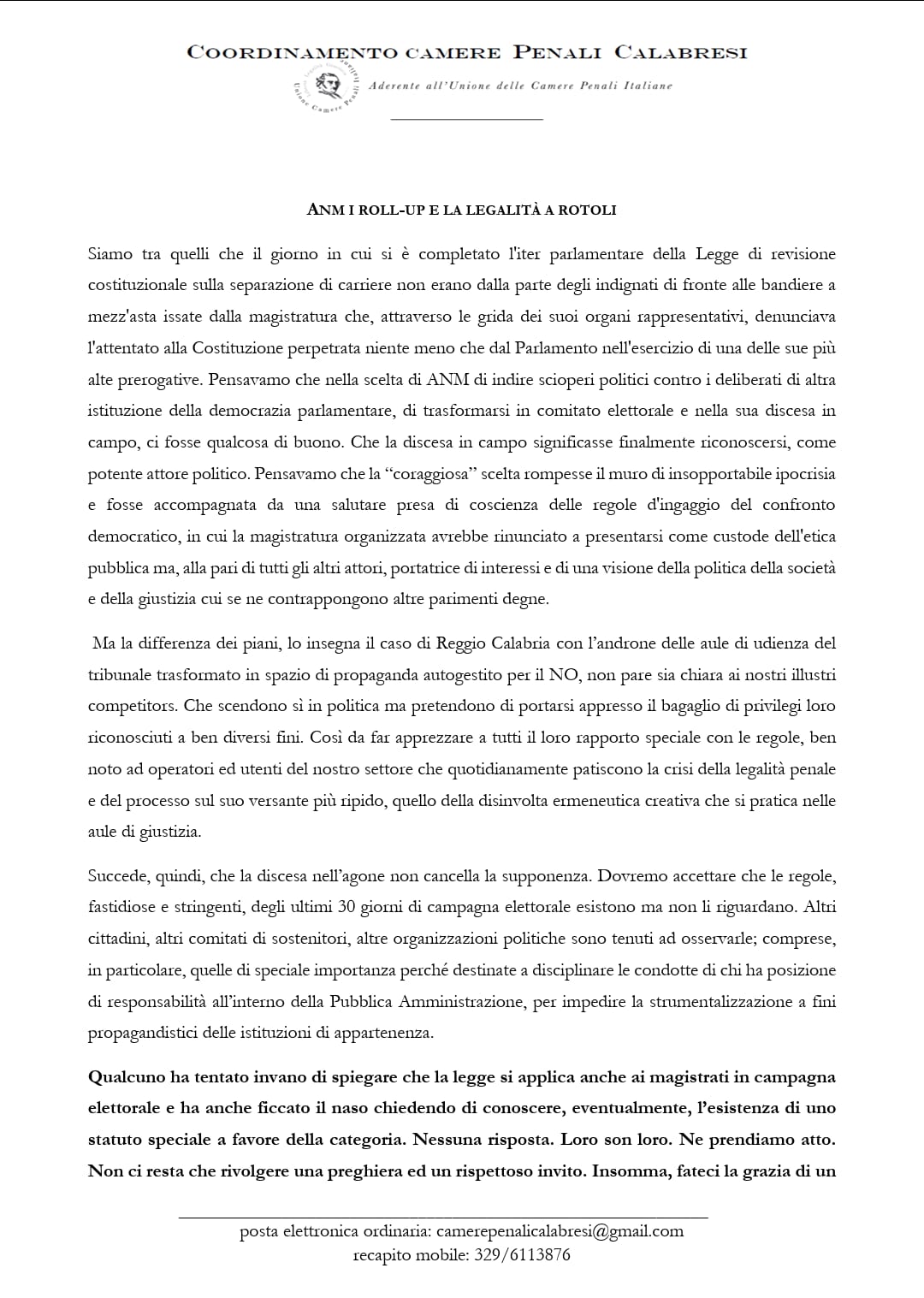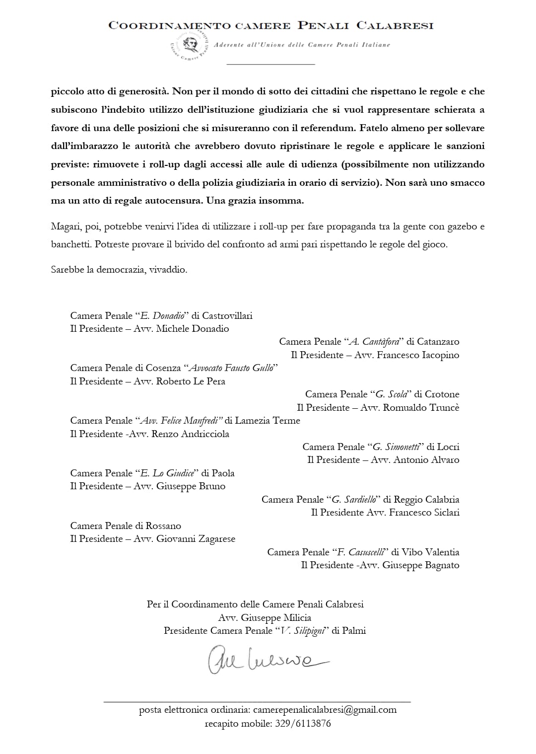 Coordinamento Camere Penali calabresi contro i roll up a ridosso delle aule di giustizia