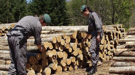 Agenti del Corpo forestale dello Stato controllano il taglio degli alberi nei boschi del cosentino.