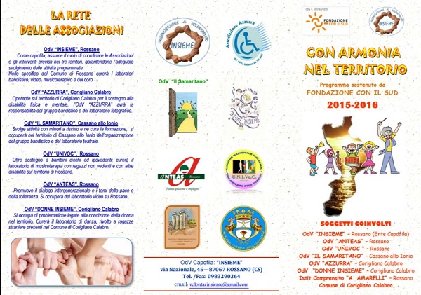 Contrastare i processi di emarginazione dovuti a disabilità, immigrazione e problemi economici; favorire l’integrazione sociale attraverso la creazione di laboratori artistico-espressivi, offrire ai ragazzi la possibilità di sviluppare doti artistiche. Sono, questi, gli obiettivi del progetto CON ARMONIA NEL TERRITORIO promosso dalla FONDAZIONE CON IL SUD, realizzato dalle associazioni di volontariato INSIEME, ANTEAS, UNIVOC, IL SAMARITANO, AZZURRA e DONNE INSIEME unitamente all’istituto comprensivo A.AMARELLI di Rossano, con il patrocinato dal Comune di Corigliano.