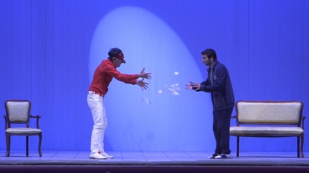 Si avvia così una paradossale situazione in cui il ‘tronchetto’-Salemme, in una sorta di monologo, interrotto solo da gustosi siparietti con gli altri personaggi, esterna le sue frustrazioni in riflessioni “tra il serio e il faceto” sulla vita, gli amici, evoca ricordi della giovinezza spensierata coll’intento di scuotere Rocco dalla sua apatia. Salemme tratteggia gag esilaranti di pura improvvisazione che si susseguono senza respiro, in uno spettacolo che rinnova e rende omaggio alla grande commedia napoletana. Salemme, anche questa volta, si è buttato a capofitto nei dialoghi improvvisati con il pubblico, è sceso in platea abbandonandosi a un botta e risposta con gli spettatori che si sono lasciati coinvolgere prendendo parte e diventando anche loro personaggi della commedia. Una girandola di colpi di scena in cui Salemme veste i panni del “tronchetto”, alter ego di Rocco, voce della coscienza, il “cuore” che sagacemente per Salemme negli uomini “si trova un po’ più in basso: nei pantaloni”. “Non possiamo che andare verso il futuro – è un sorriso arrendevole quello di Salemme – noi cinquant’enni abbiamo vissuto in un’epoca più semplice da comprendere. Avevamo la gioia di lasciare la nostra casa, il nostro condominio, il quartiere in cui eravamo nati alla volta del mondo. Un viaggio misterioso che ci entusiasmava. Ora, è cambiato tutto. Cosa lasciamo ai nostri figli? Solo la paura di affrontare il mondo, gli impediamo di saltare nel buio, di scoprire il loro futuro” così chiude la sua irresistibile commedia Salemme. Tutto questo raccontato con il ritmo della farsa per lasciare il passo, in alcuni passaggi, alla moderna commedia napoletana.