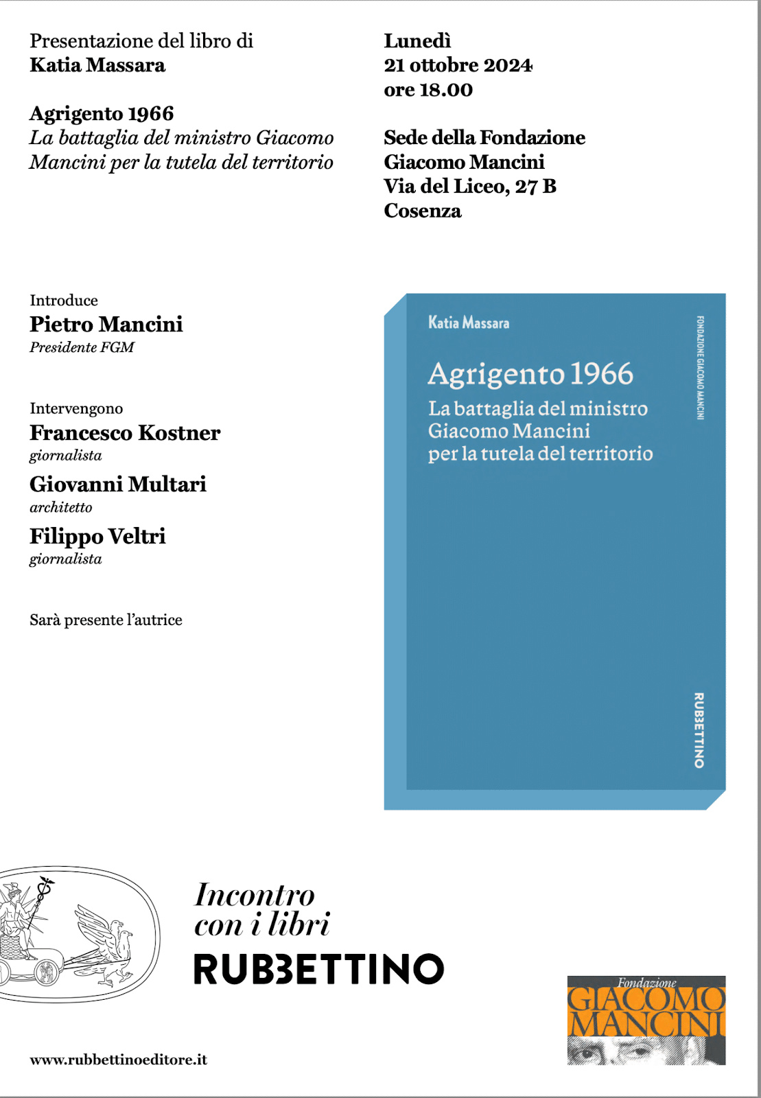 vi ricordiamo l’appuntmento di domani, lunedì 21 ottobre, alle ore 18 presso la sede della FGM a Cosenza per la presentazione del volume di Katia Massara dal titolo “Agrigento 1966, la battaglia del Ministro Giacomo Mancini per la tutela del territorio” edito da Rubbettino.