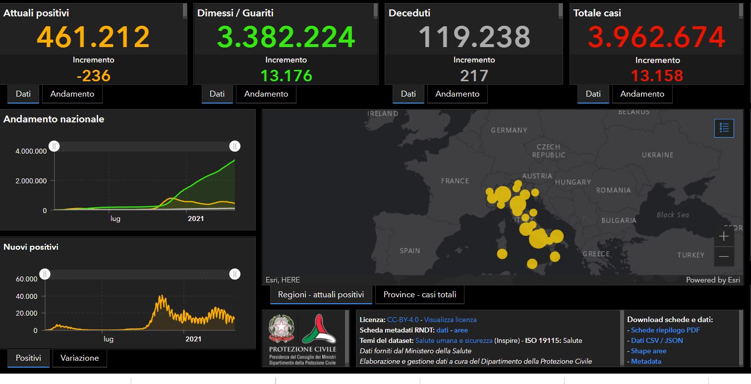 ROMA (ITALPRESS) – Sono 13.158 i nuovi casi di Coronavirus in Italia (ieri 13.817) a fronte di 239.482 tamponi effettuati su un totale di 57.126.017 da inizio emergenza. E’ quanto si legge nel bollettino del Ministero della Salute – Istituto Superiore di Sanità di oggi. Nelle ultime 24 ore sono stati 217 i decessi (ieri 322), che portano il totale di vittime da inizio pandemia a 119.238. Con quelli di oggi diventano 3.962.674 i casi totali di Covid in Italia. Attualmente i positivi sono 461.212 (-236), 437.688 le persone in isolamento domiciliare. I ricoverati in ospedale con sintomi sono 20.971 di cui 2.862 in Terapia intensiva. I dimessi/guariti sono 3.382.224 con un incremento di 13.176 unità nelle ultime 24 ore.